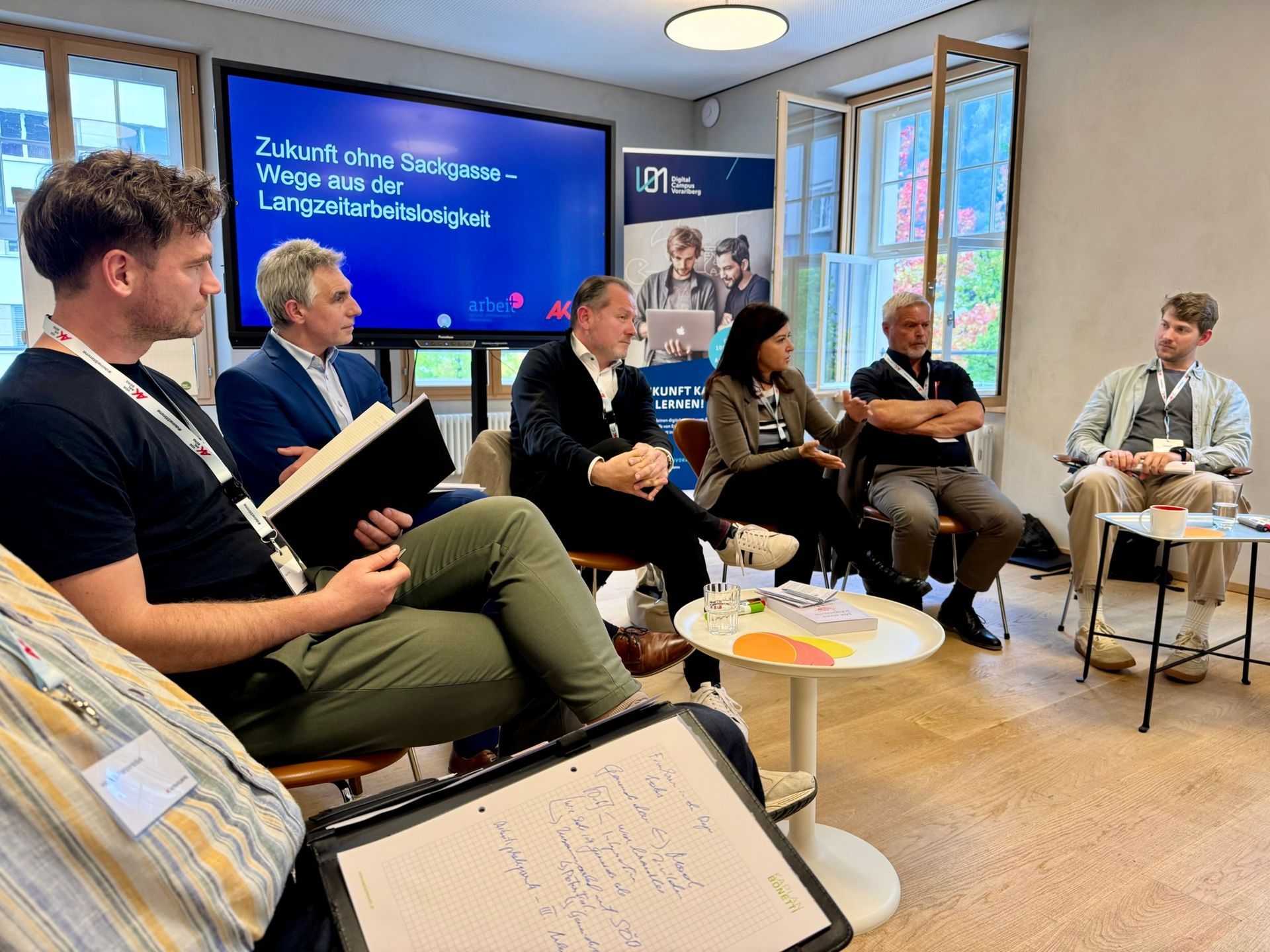 Langzeitarbeitslosigkeit ist eine wachsende Herausforderung für die Betroffenen wie für die Gesellschaft. Die Lebenslagen sind oft komplex. Viele Menschen wollen arbeiten, finden aber keinen Zugang zum Arbeitsmarkt. Sie stecken im System fest und brauchen Perspektiven, die wirklich hilfreich und weiterführend sind. Perspektiven, die finanzielle Absicherung, Lebensqualität und soziale Teilhabe der Teilnehmenden verbessern. Der Fachdialog am 9.10.2025 schaffte Raum, um Bilder zu konkretisieren und Ansätze wie eine Jobgarantie ins Gespräch zu bringen, Unser Ziel war, gemeinsam mögliche Schritte zu entwickeln – über theoretische Modelle hinaus. Erfahrungen und Sichtweisen waren gefragt – denn gute Lösungen entstehen, wenn viele Perspektiven zusammenkommen. Die Perspektiven von Clara Moder (Expertin für Arbeitsmarkt- und Sozialpolitik und Autorin*), Simon Theurl (Experte für Arbeitsmarktpolitik, AK Wien, Autor*), Bernhard Bereuter (GF AMS Vorarlberg), René Fink (Fachkoordination Arbeit und Beschäftigung Dornbirn, pro mente Vorarlberg) und Harald Witwer (Bgm. Gemeinde Thüringen) waren wertvolle Inputs für den darauffolgenden Dialog, moderiert von Dominic Götz (Interessenspolitik AK Vorarlberg) und Ulli Schmid-Santer (GF arbeit plus Vorarlberg). Der Einladung von arbeit plus Vorarlberg und der AK Vorarlberg folgten Vertreter:innen der Sozialen Unternehmen, arbeit plus Tirol, ÖGK, Land Vorarlberg und ÖGB . Statements Clara Moder: „Arbeitslosigkeit kann jede:n treffen – für viele ist sie nur eine kurze Phase. Zum Problem wird sie, wenn sie lange anhält: Rund ein Drittel aller Arbeitslosen ist langzeitbeschäftigungslos, also über ein Jahr ohne Job. Besonders betroffen sind Ältere, Menschen mit gesundheitlichen Einschränkungen, niedriger Bildung oder Migrationsgeschichte. Je länger die Arbeitslosigkeit dauert, desto schwerer ist der Wiedereinstieg – mit Folgen von Entmutigung bis hin zu psychischen Belastungen. Menschen wollen arbeiten und Teil der Gesellschaft sein. Deshalb braucht es mehr als bloße Vermittlung: gezielte Betreuung, Qualifizierung und geförderte Beschäftigung. Eine regionale Jobgarantie kann hier neue Perspektiven schaffen – freiwillig, existenzsichernd und mit Entwicklungsmöglichkeiten. Sie eröffnet Chancen für jene, die sonst oft aufgegeben werden, und stärkt zugleich die öffentliche Daseinsvorsorge. Erfahrungen aus Sozialen Unternehmen zeigen, wie ein solches Modell gelingen kann – und dass eine Gesellschaft ohne Langzeitarbeitslosigkeit möglich ist.“ Simon Theurl: "Die meisten Langzeitarbeitslosen wollen arbeiten, finden aber niemanden der sie einstellt und einige benötigen besondere Unterstützung, um wieder in Beschäftigung zu gelangen. Hier sehe ich die Politik in der Verantwortung dafür zu sorgen, gute Arbeitsplätze und die nötigen Unterstützungsangebote für diejenigen zu schaffen, die das wollen. Das lässt sich auch in Zeiten der Budgetsanierung finanzieren, dann, wenn die Ausgaben, die für diese Menschen sowieso anfallen, für die Finanzierung von Arbeitsplätzen verwendet werden könnten. Aber auch durch entsprechende Kooperationen zwischen Gemeinden, Arbeitsmarktservice und Unternehmen können Ressourcen zur Verfügung gestellt werden. Die Erfahrung zeigt, dass gute und sinnstiftende Arbeit die negativen Folgen von Arbeitslosigkeit umkehren kann und die Menschen nachhaltig in Beschäftigung gelangen und bleiben. Deshalb finanzieren sich solche Maßnahmen für Langzeitbeschäftigungslose nach einer gewissen Zeit selbst – und es ist für alle besser eine sinnstiftende Tätigkeit zu finanzieren, anstatt Arbeitslosigkeit. Nicht zuletzt kann die Wahl und Organisation solcher Arbeitsplätze demokratisch gestaltet werden. Die Beteiligung der Gemeinden, Sozialpartner, Trägerorganisation und Betroffenen, stellt nicht nur sicher, dass sinnvolle Arbeitsplätze geschaffen werden (weil sichergestellt wird, dass sowohl Nachfrage als auch Angebot bestehen), sondern birgt auch die Chance auch die Wirtschaft ein Stück demokratischer und partizipativer zu gestalten." Bernhard Bereuter: "Trotz intensiver Vermittlungsbemühungen, individueller Unterstützungs- und Qualifizierungsmaßnahmen, gezielter Förderungen für Unternehmen sowie temporärer Beschäftigungsangebote in Sozialökonomischen Betrieben gelingt es nicht, für alle Personen eine nachhaltige Integration in den Arbeitsmarkt zu erreichen. Insbesondere für Personen mit mehrfachen Vermittlungshemmnissen zeigt sich, dass bestehende Maßnahmen oft nicht ausreichen, um dauerhafte Beschäftigungsperspektiven zu schaffen.“ * „Mit einer Jobgarantie zum Recht auf gute Arbeit. Ansätze fortschrittlicher Arbeitsmarktpolitik in Österreich.“ Clara Moder: „Jobgarantie als Chance nachhaltiger Arbeitsmarktintegration – Die Perspektive der Sozialen Unternehmen und Maßnahmen zur beruflichen Inklusion.“ Simon Theurl: „Eine Frage des politischen Willens und nicht der Kosten.“