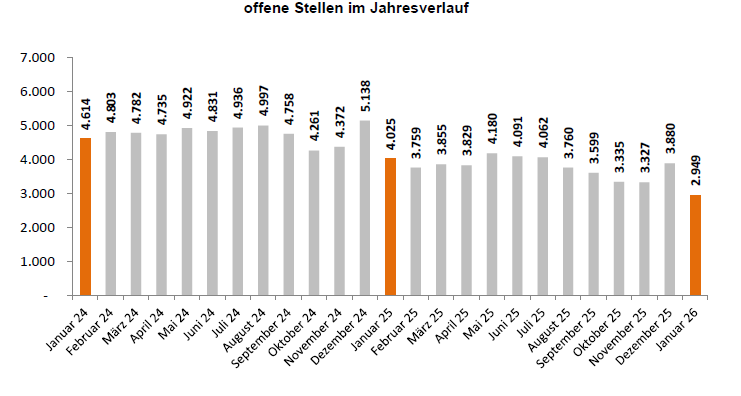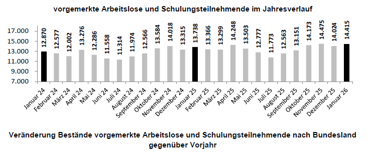 Ende Jänner 2026 waren 11.899 Personen beim AMS Vorarlberg arbeitslos vorgemerkt. Dies entsprach einem Anstieg von 722 Personen oder 6,5 Prozent gegenüber dem Vorjahr. Die Summe der vorgemerkten Arbeitslosen und der Schulungsteilnehmenden beträgt 14.415 Personen. Die Anzahl der offenen Stellen ist im Vergleich zu Dezember auf 2.949 Stellen um rund 100 Stellen gesunken.