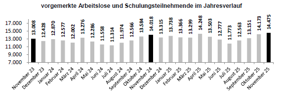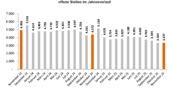 Ende November 2025 waren 11.822 Personen beim AMS Vorarlberg arbeitslos vorgemerkt. Dies entsprach einem Anstieg von 446Personen oder 3,9 Prozent gegenüber dem Vorjahr. Die Summe der vorgemerkten Arbeitslosen und der Schulungsteilnehmenden beträgt 14.475 Personen. In den Monaten Oktober und November erreichten diese Zahlen den Höchststand der vergangenen zwei Jahren. Gleichzeitig ist die Anzahl der offenen Stellen auf dem niedrigsten Stand seit 11/2023, Tendenz sinkend.