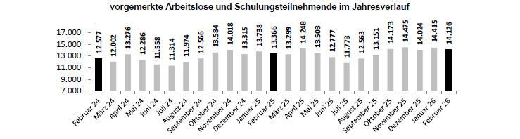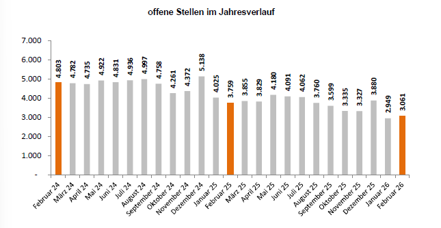 Ende Februar 2026 waren 11.474 Personen beim AMS Vorarlberg arbeitslos vorgemerkt. Dies entspricht einem Anstieg von 767 Personen oder +7,2% gegenüber dem Vorjahr. Die Summe der vorgemerkten Arbeitslosen und der Schulungsteilnehmenden beträgt 14.126 Personen. Die Anzahl der offenen Stellen ist im Vergleich zu Jänner auf 3.061 Stellen um rund 110 Stellen angewachsen.
