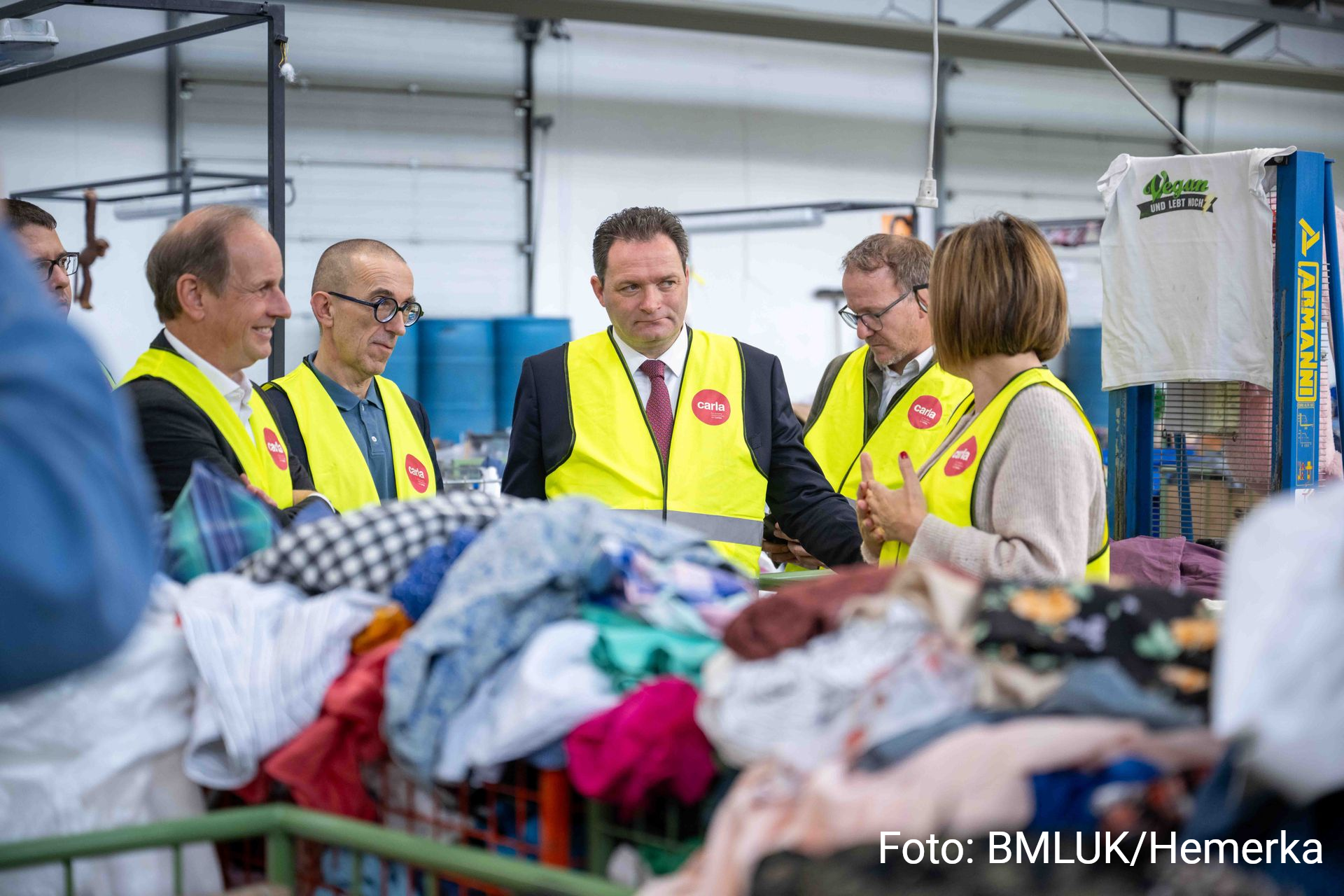Umweltminister Norbert Totschnig besuchte das carla Tex Kleidersortierwerk in Hohenems, das als österreichweites Leuchtturmprojekt gilt. Begleitet wurde der Umweltminister unter anderem von Landesrat Christian Gantner, Bürgermeister Dieter Egger und Stadtrat Thomas Fußenegger.